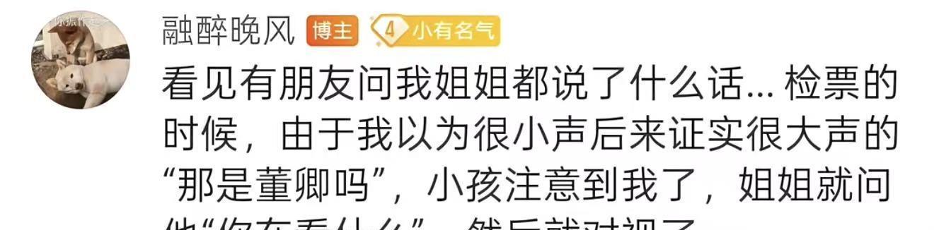 网友认出董卿的过程也有些好笑,检票的时候她就认出了董卿,用一种她自认为很小声但是别人都听到的声音询问“这是董卿吗”,引得董卿的孩子都和她对视了,而董卿看到孩子转过身询问孩子你在看什么,于是乎博主就和董卿对视了。