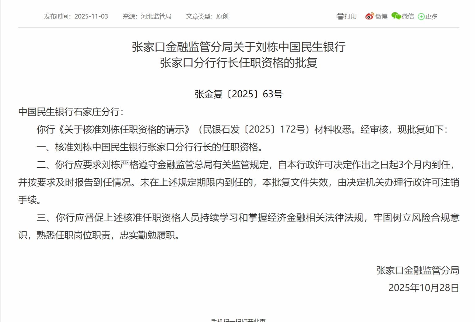11月3日科银宏泰,张家口金融监管分局发布关于刘栋中国民生银行张家口分行行长任职资格的批复,核准刘栋中国民生银行张家口分行行长的任职资格。